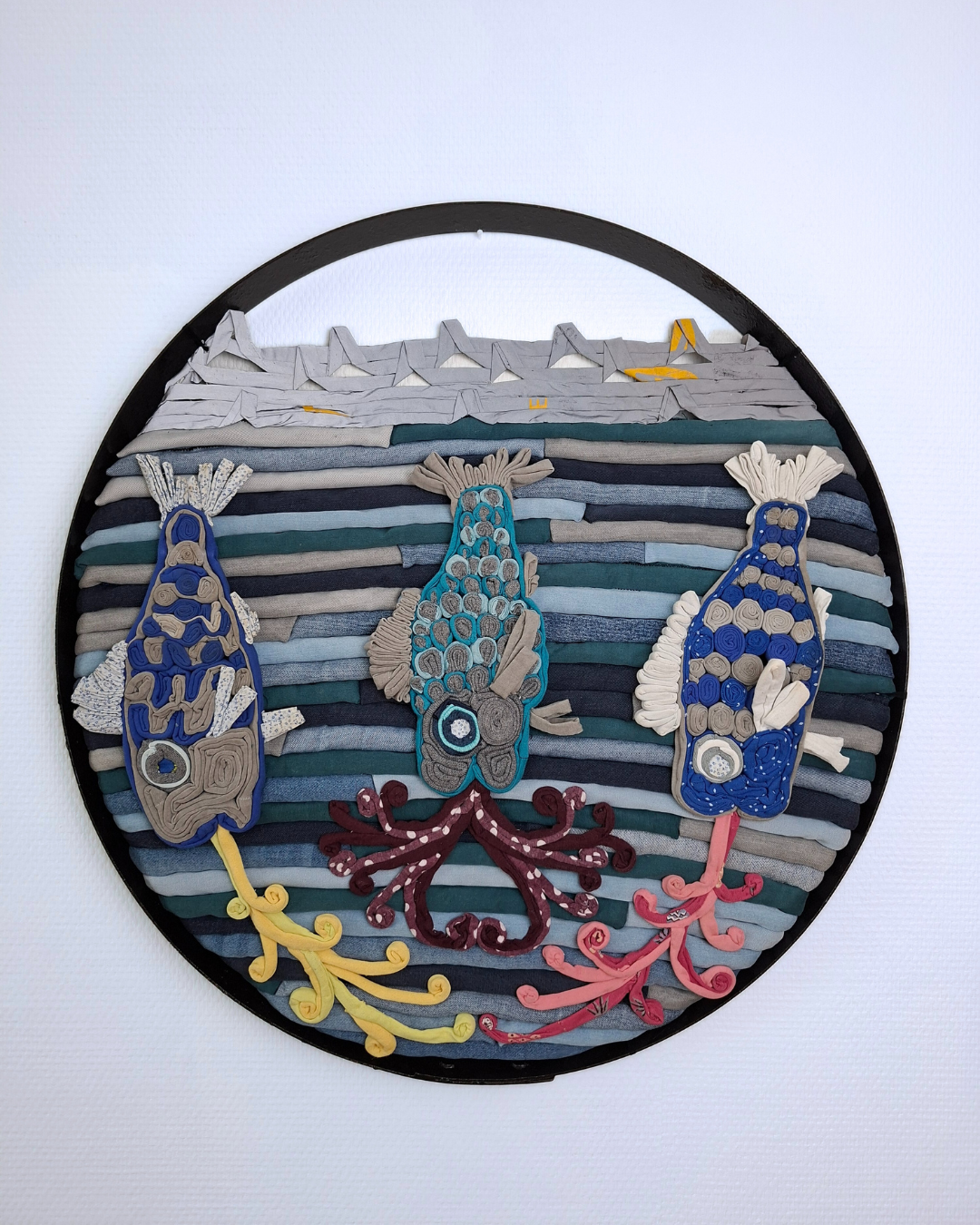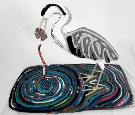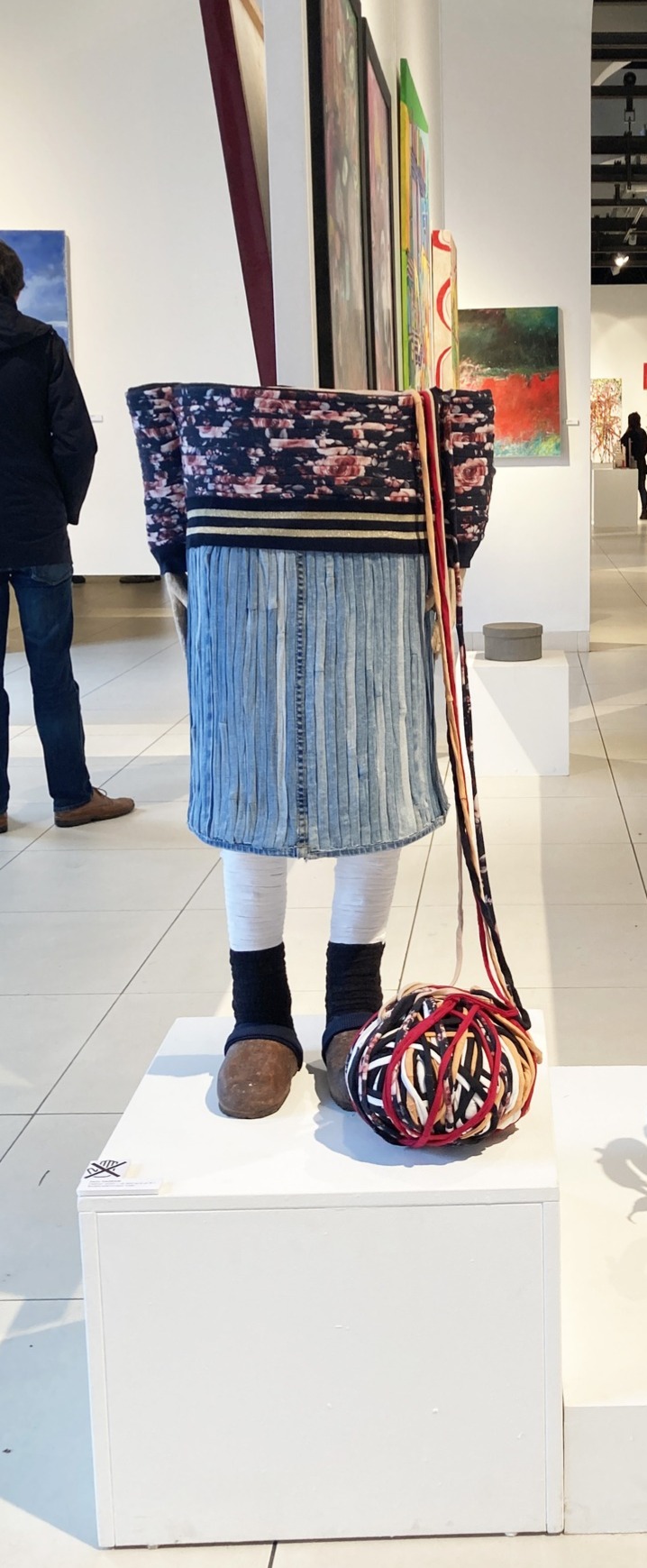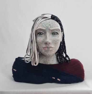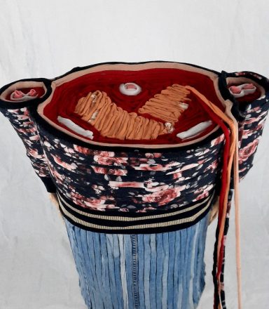 puis jetés. Elle utilise actuellement pour ses créations des vêtements abîmés qu’elle découpe, coud et assemble, jouant avec les textures et les couleurs tout en questionnant l’industrie textile.